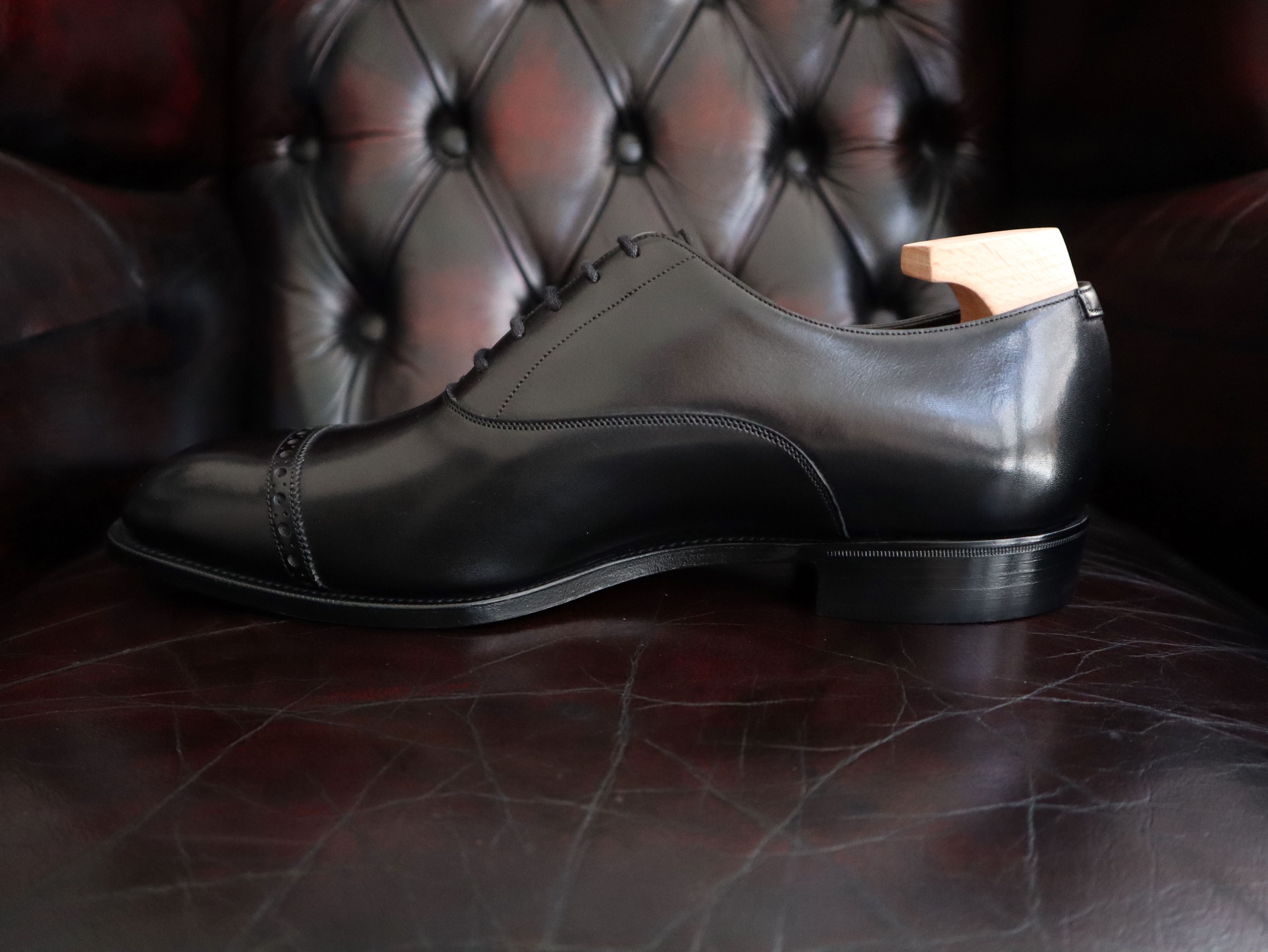 Our punched cap-toe Oxford from the Classic collection. Hand crafted in Black Calf on our Soft-Square S45 last.