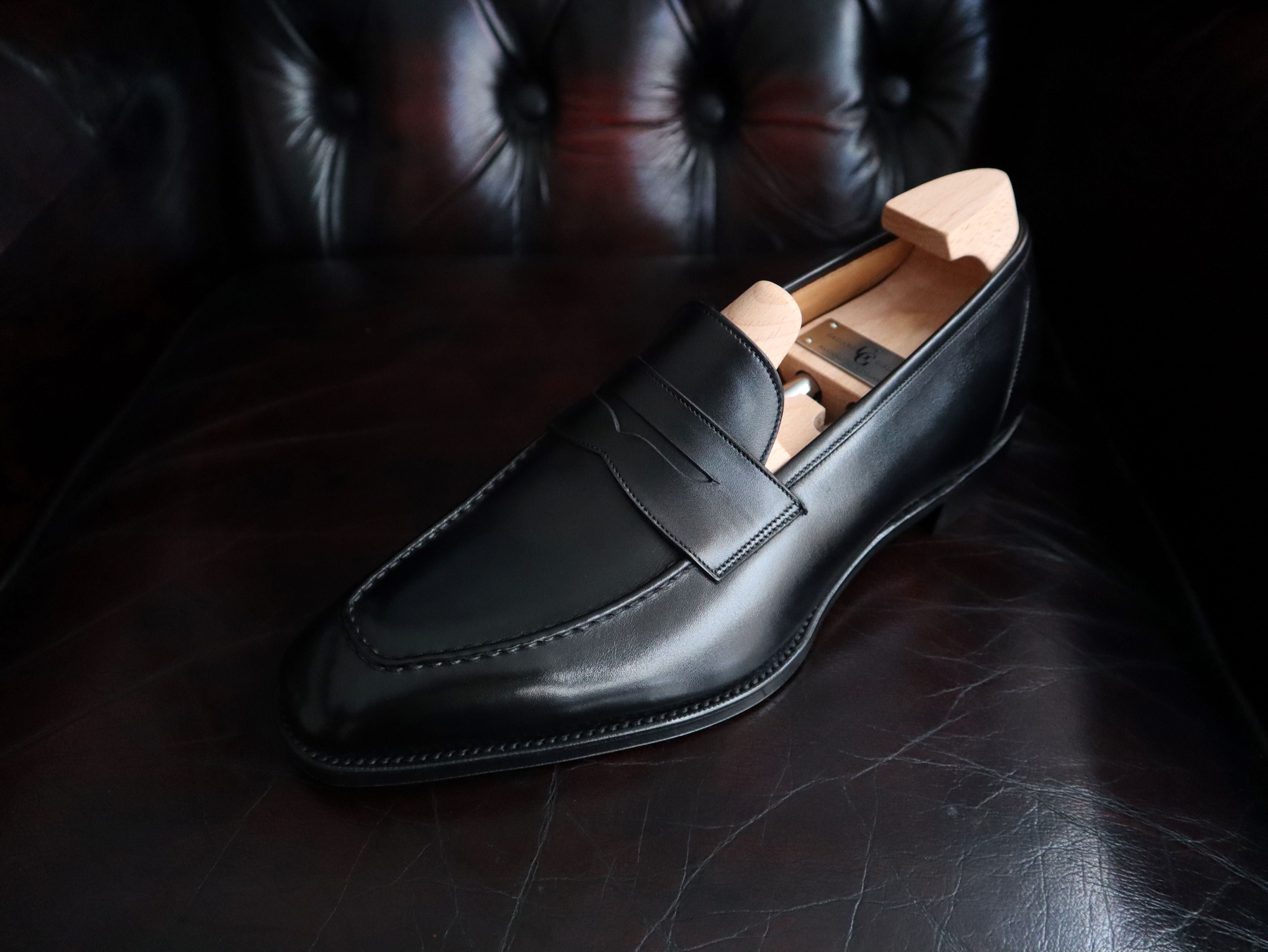 Our stylish Penny Loafer with a hand-sewn apron. Hand crafted from beautiful Black Calf on our Soft Square Slip-On KN14 last.