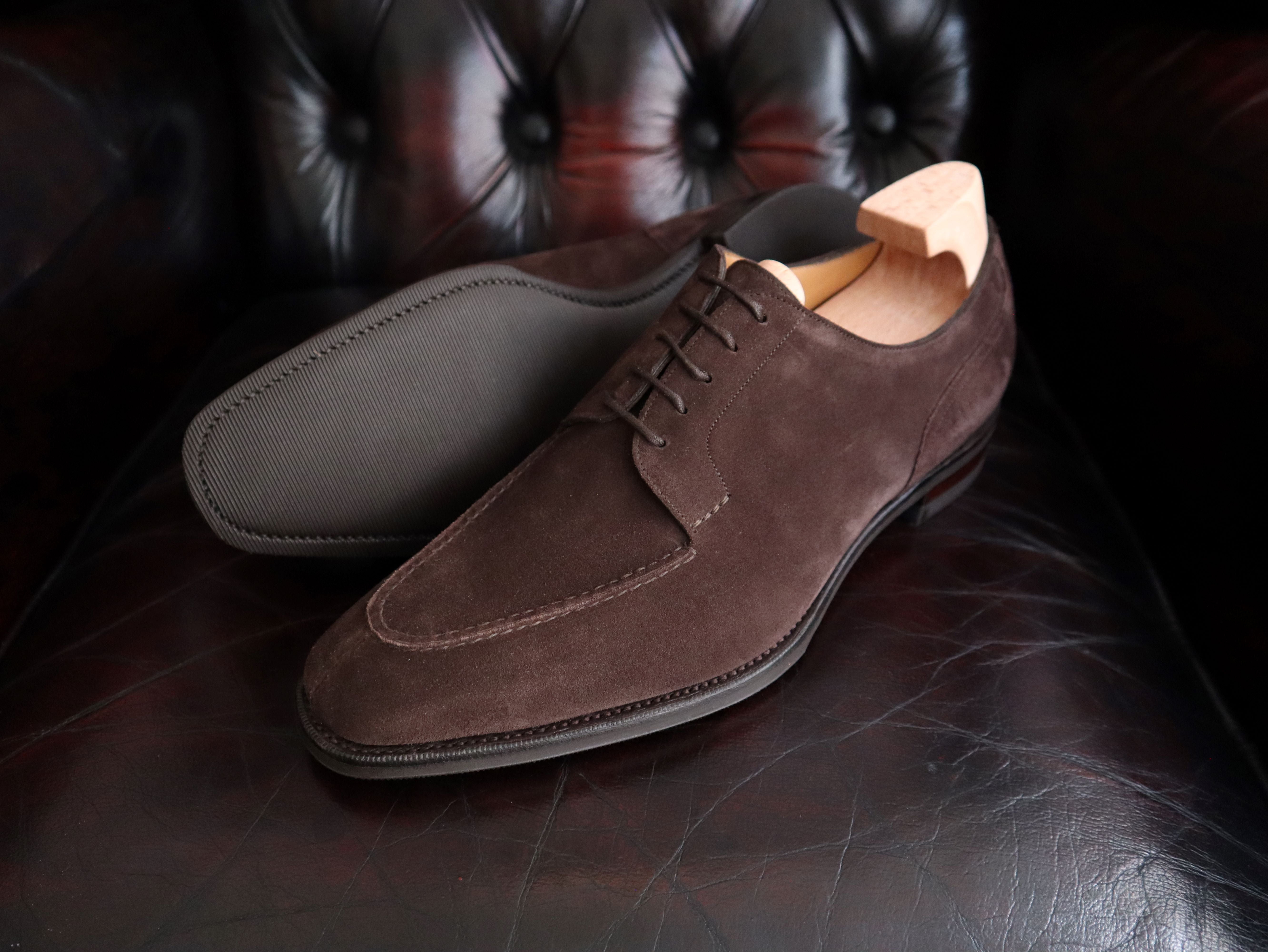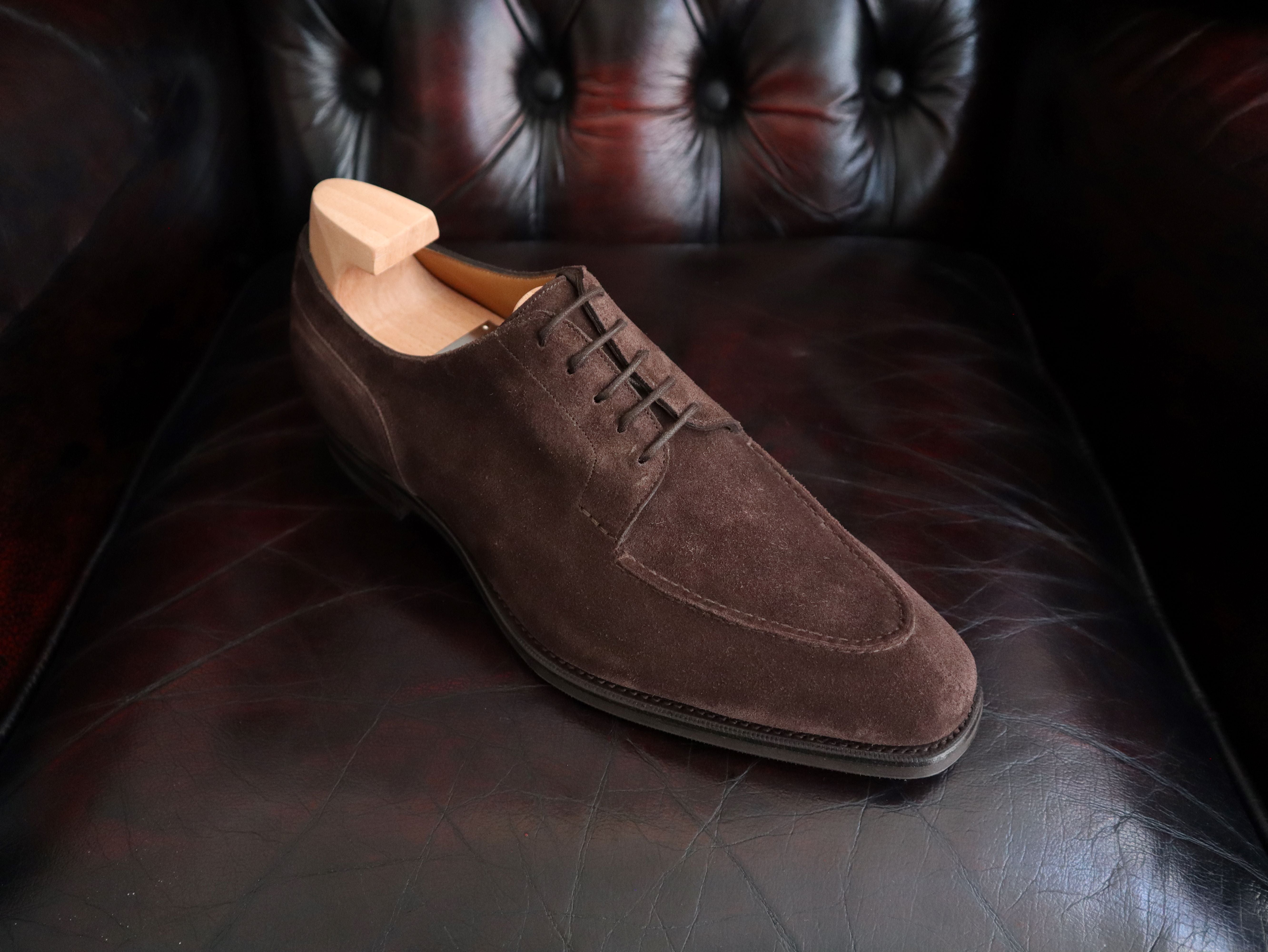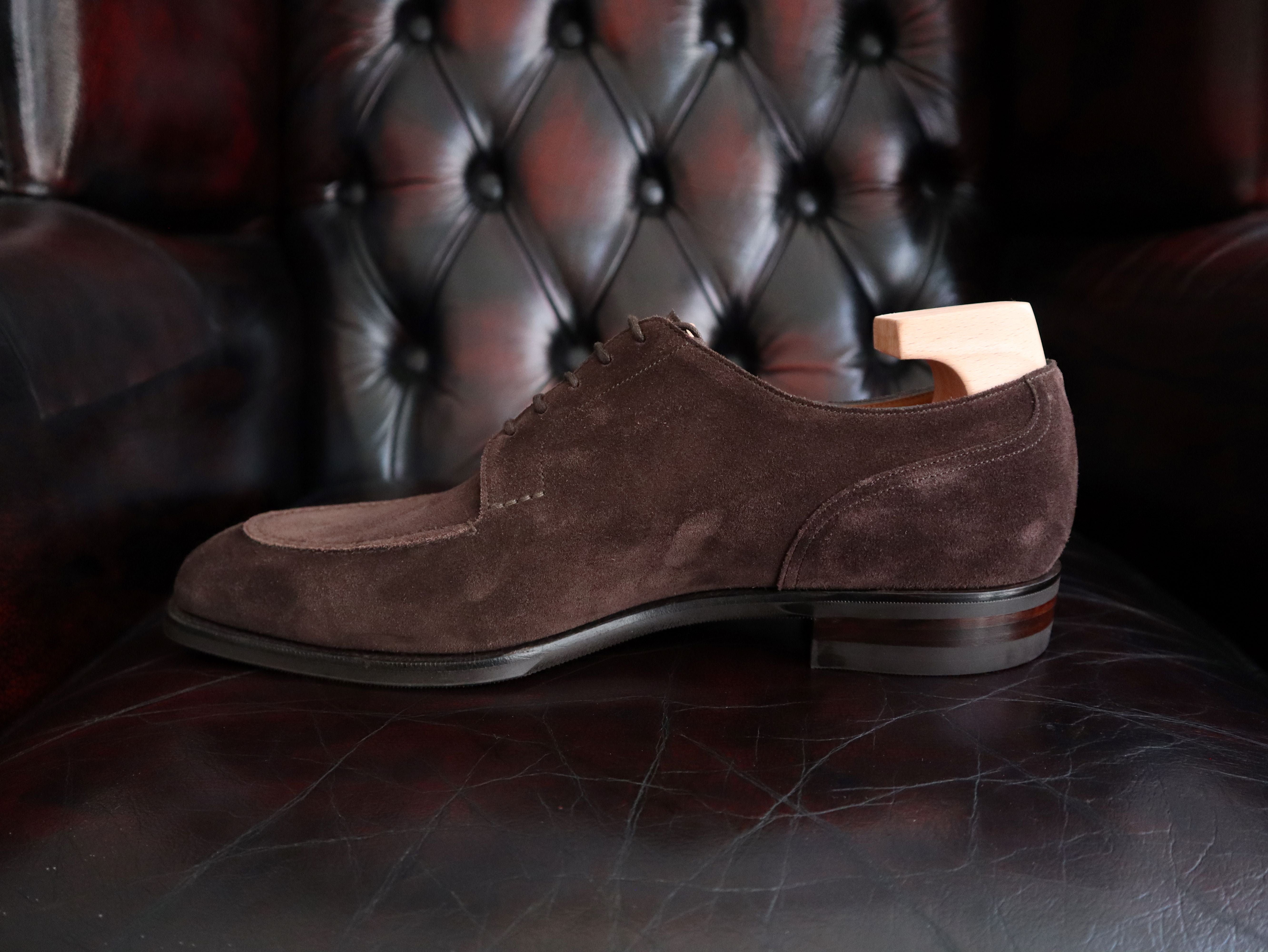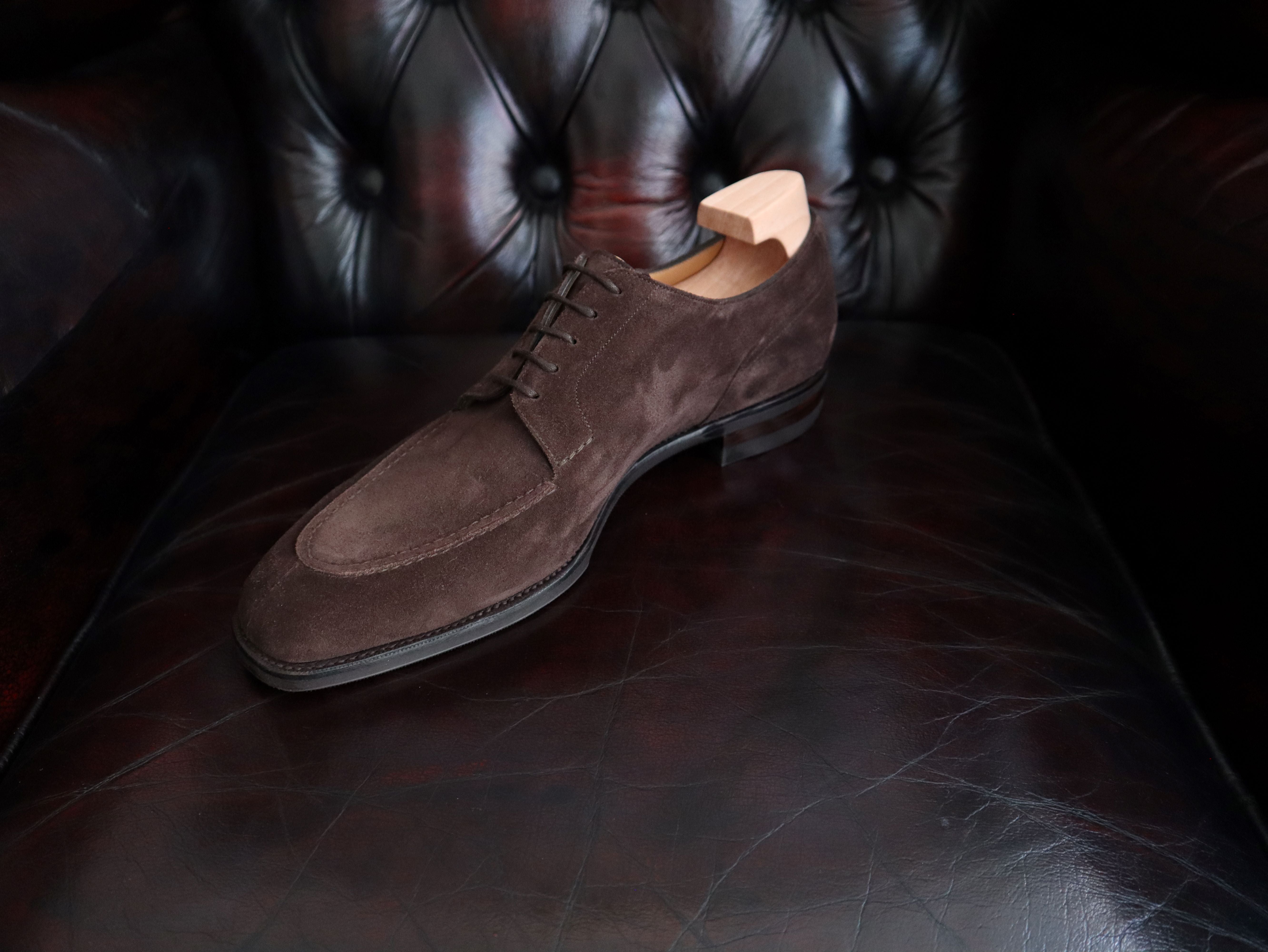A five-eyelet Split-Toe Derby, handcrafted from beautiful Mole Suede, with a single rubber Wensum sole on our Soft Square MH71 last.