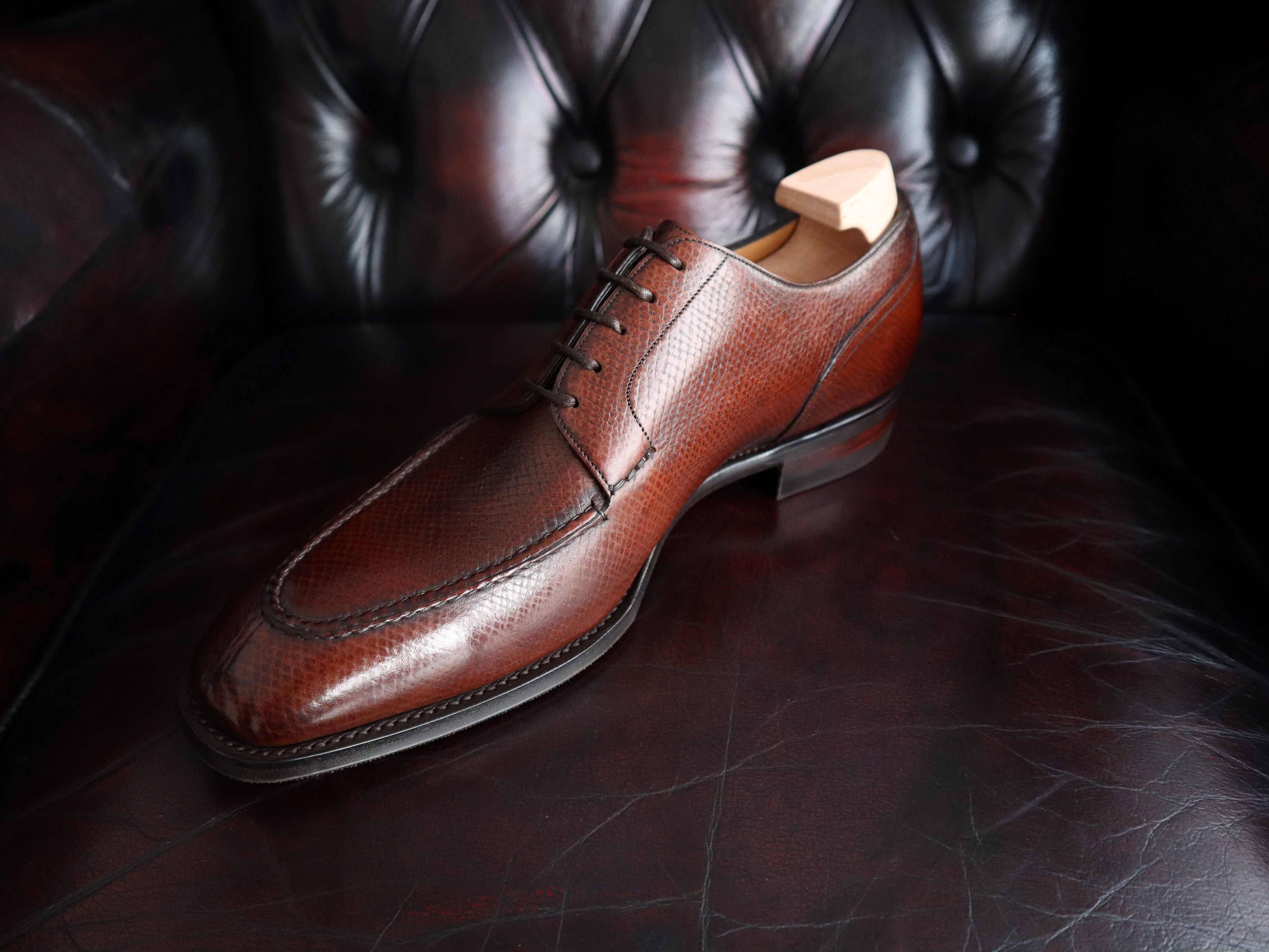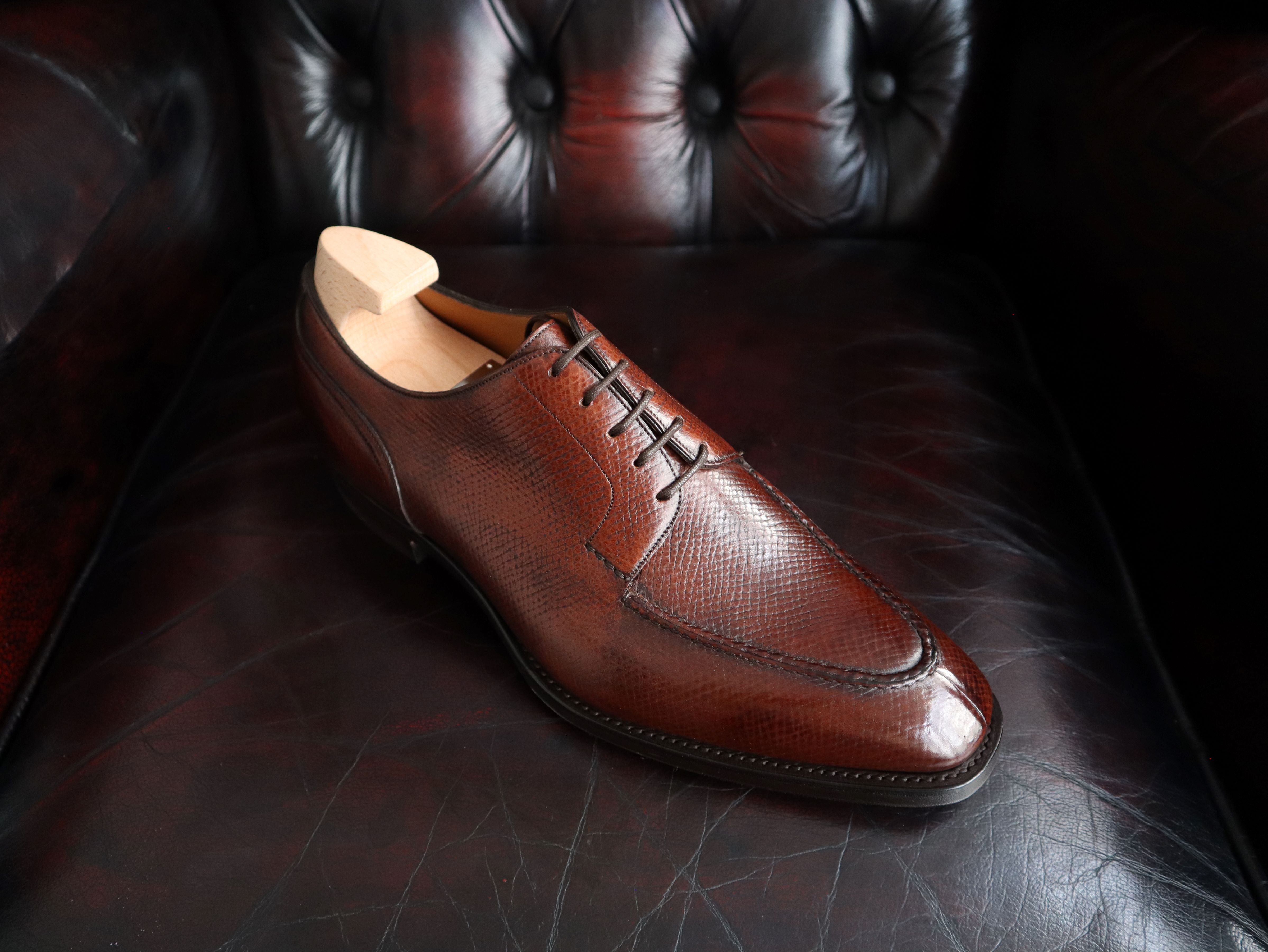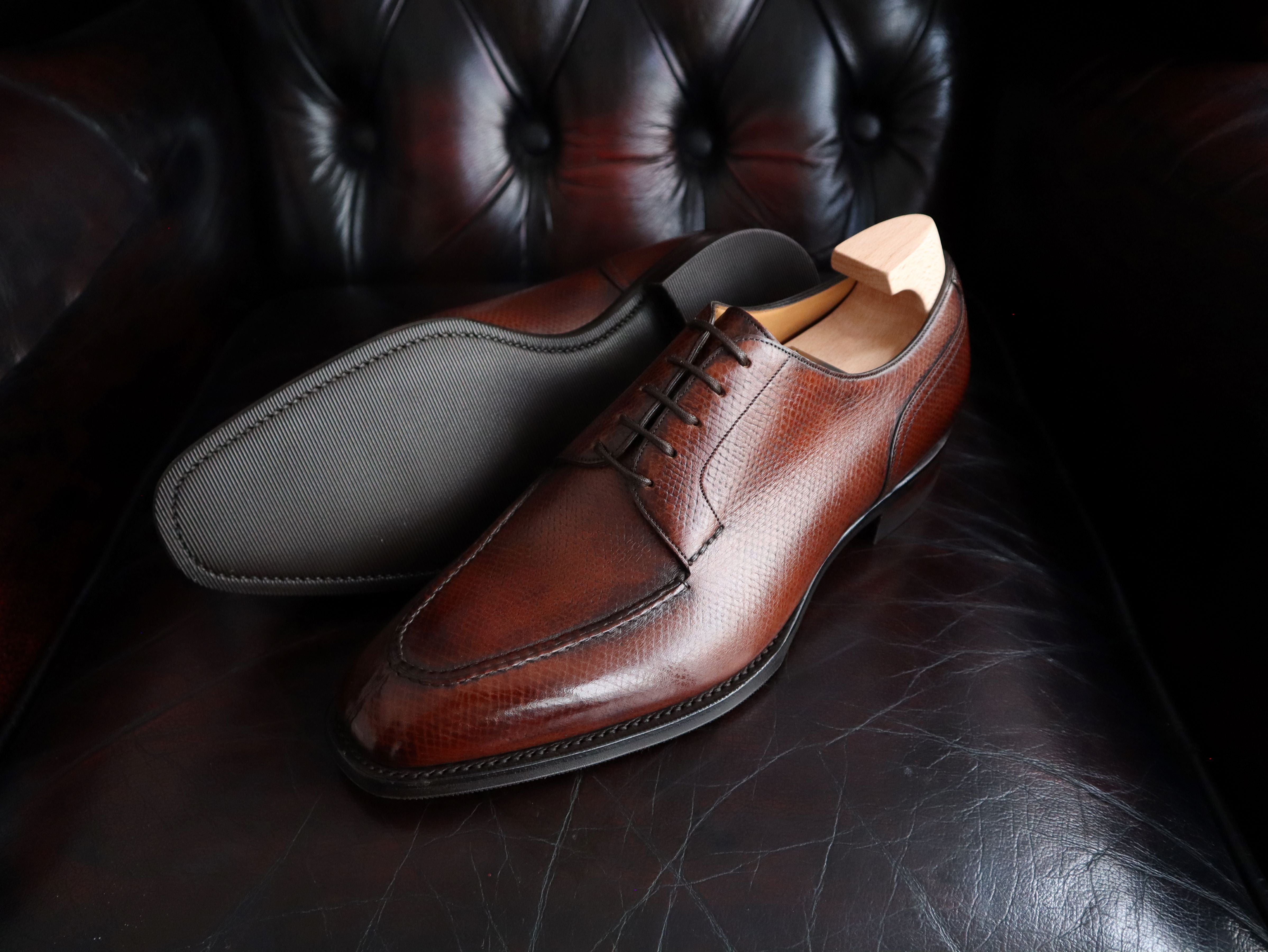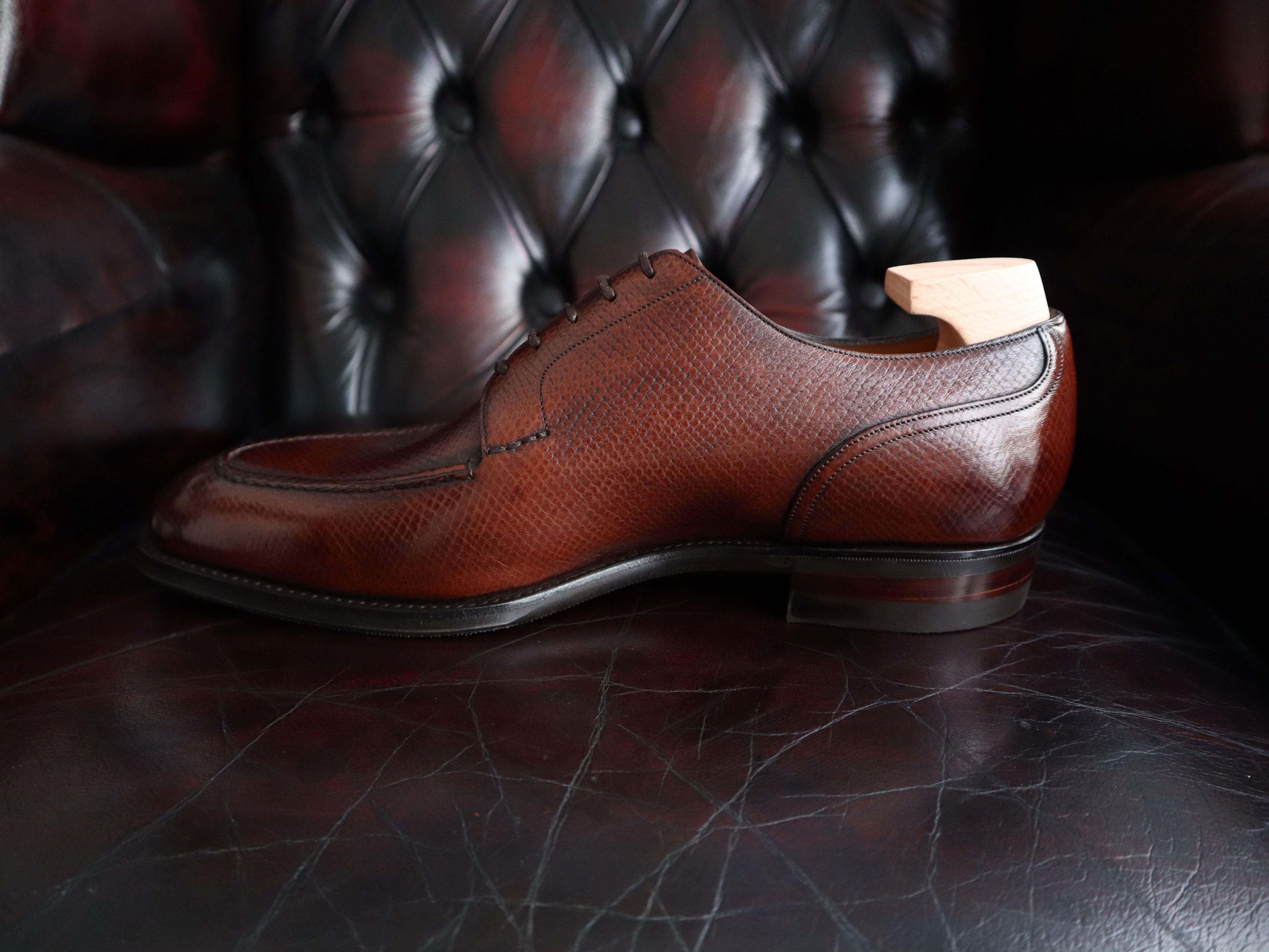 A five-eyelet Split-Toe Derby, handcrafted from beautiful Oak Hatch Grain, with a single rubber Wensum sole on our Soft Square MH71 last.
