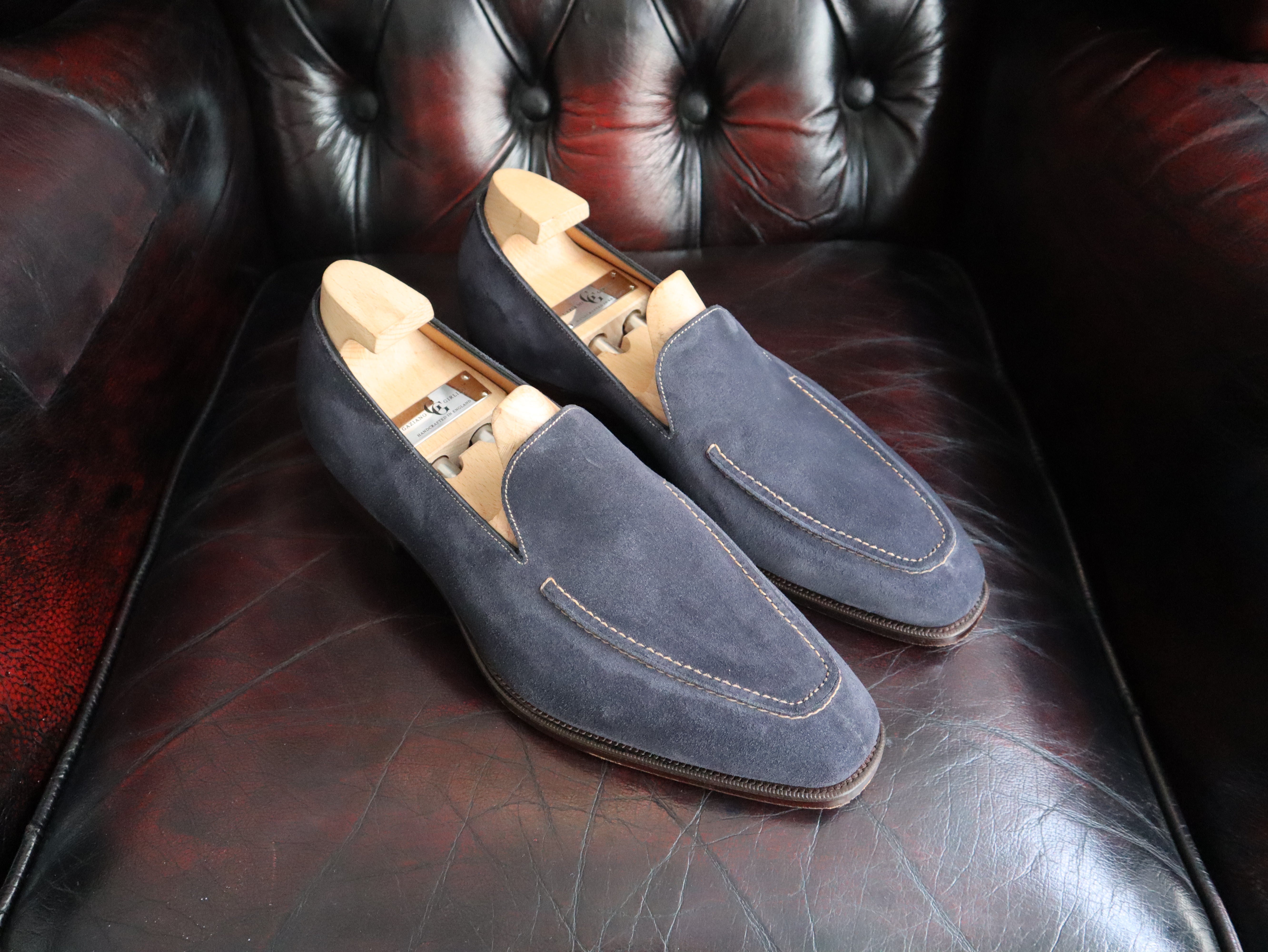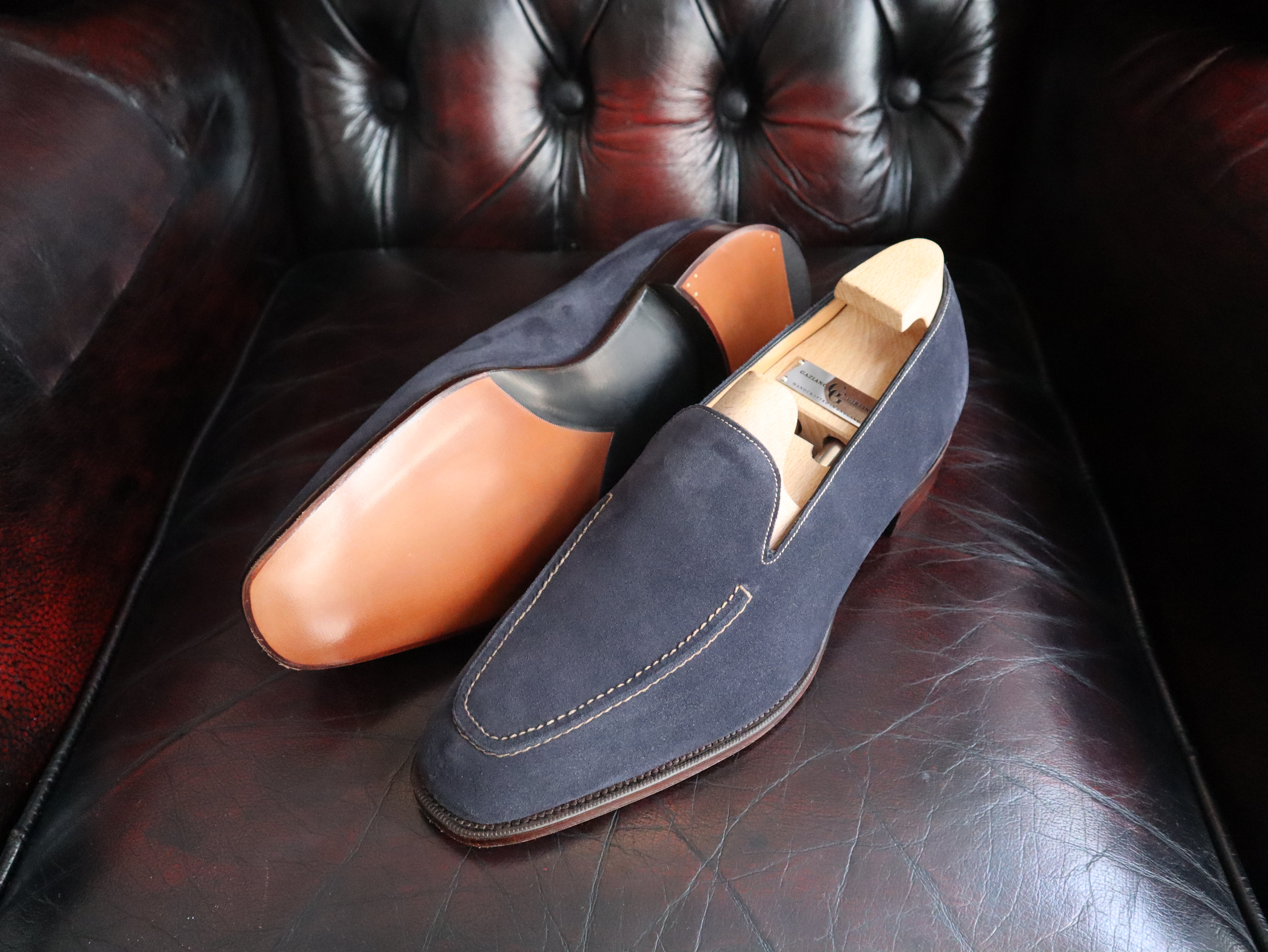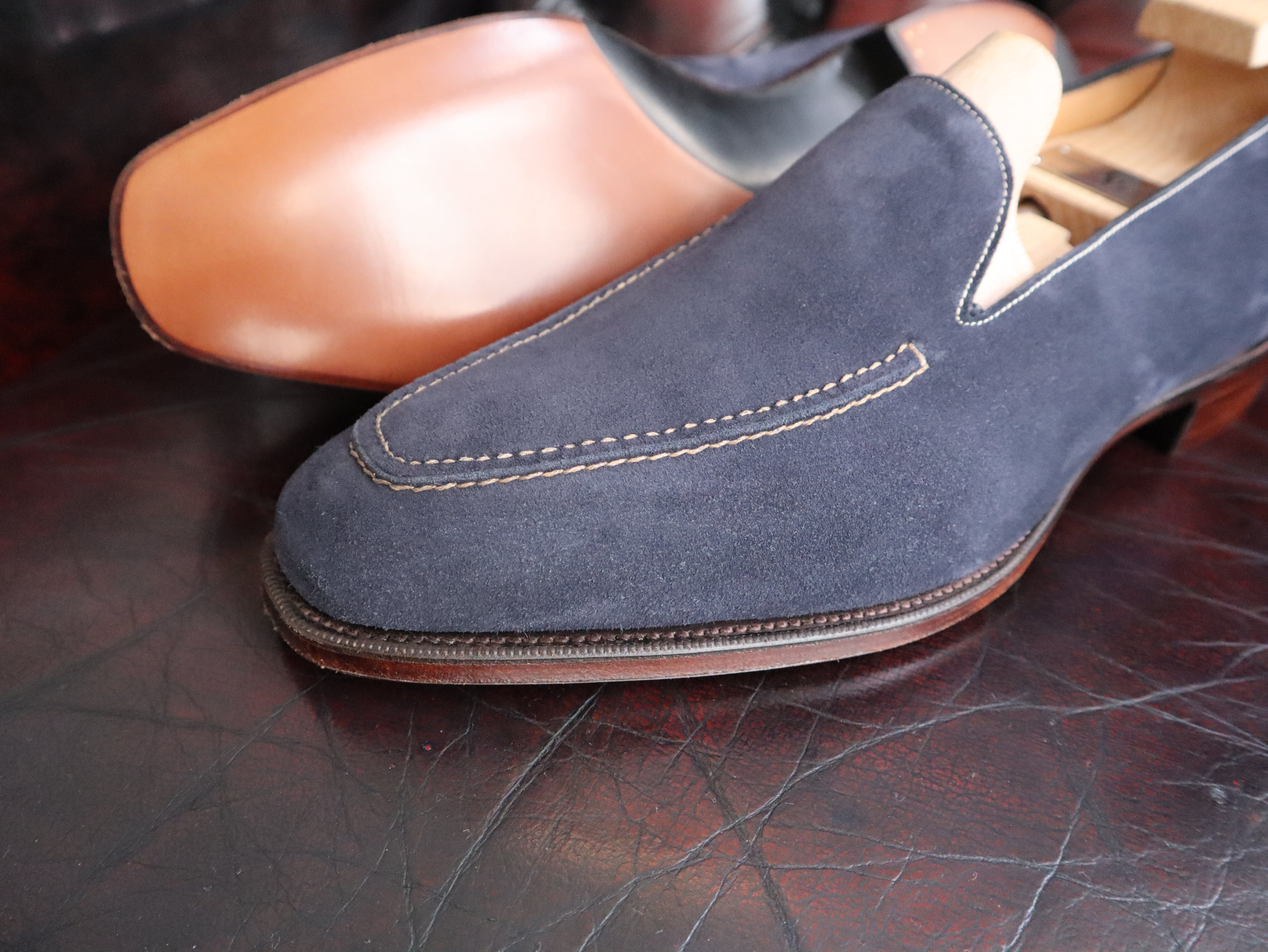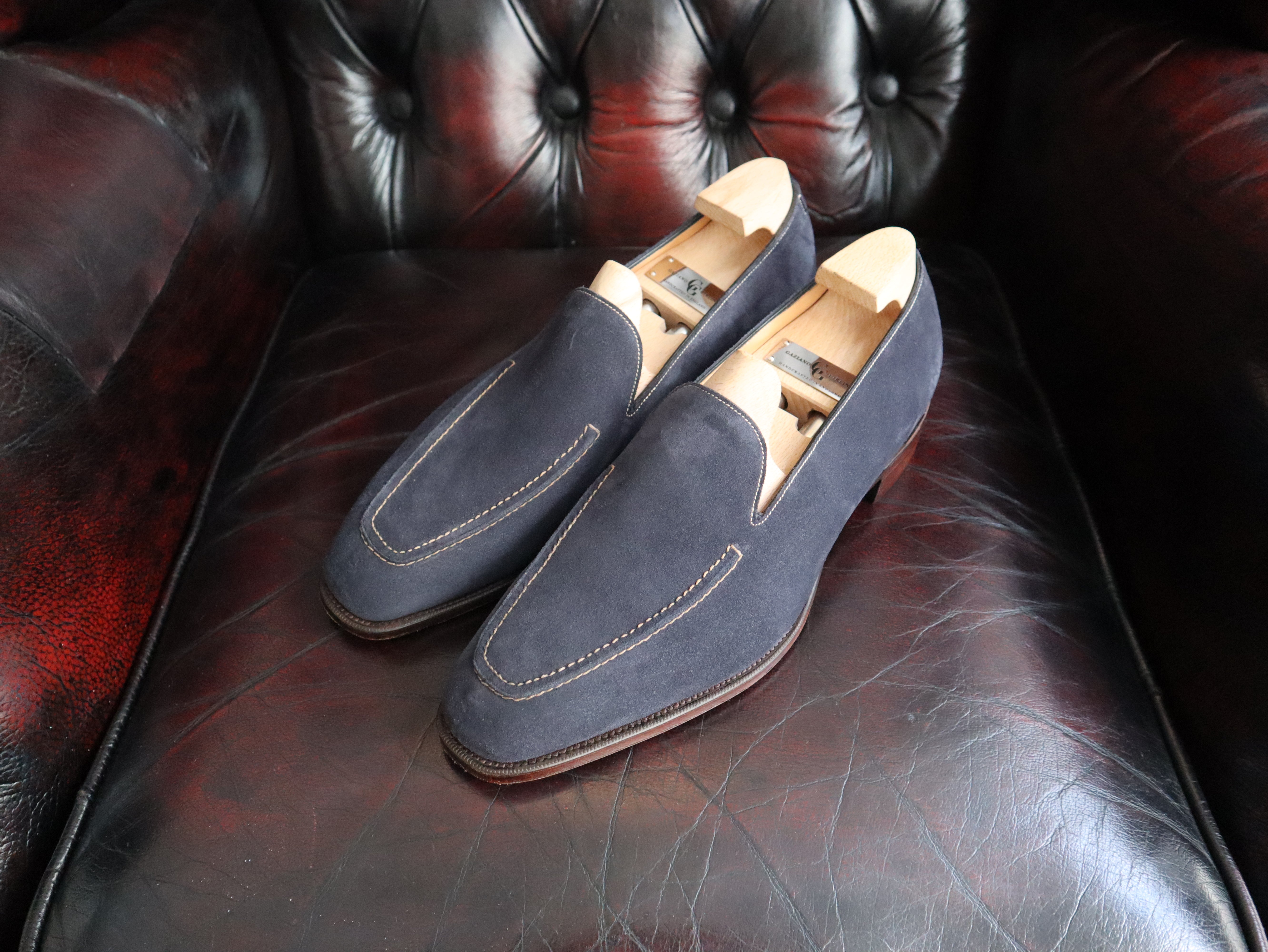 The elegant Cannes with our hand-sewn apron and split toe seam. Hand crafted from beautiful Navy Suede with a beige contrast stitch on our Soft Square Slip-On KN14 last.