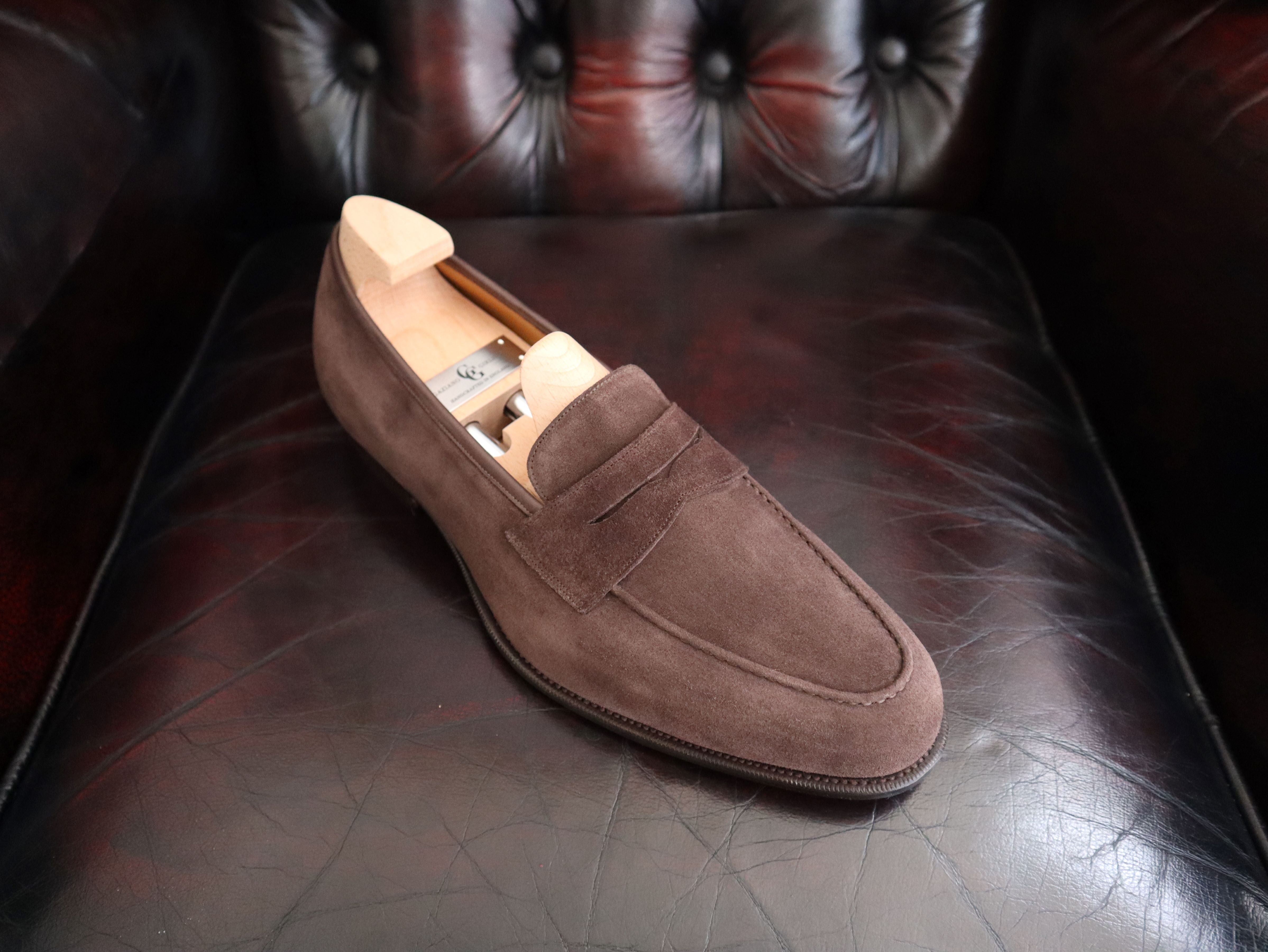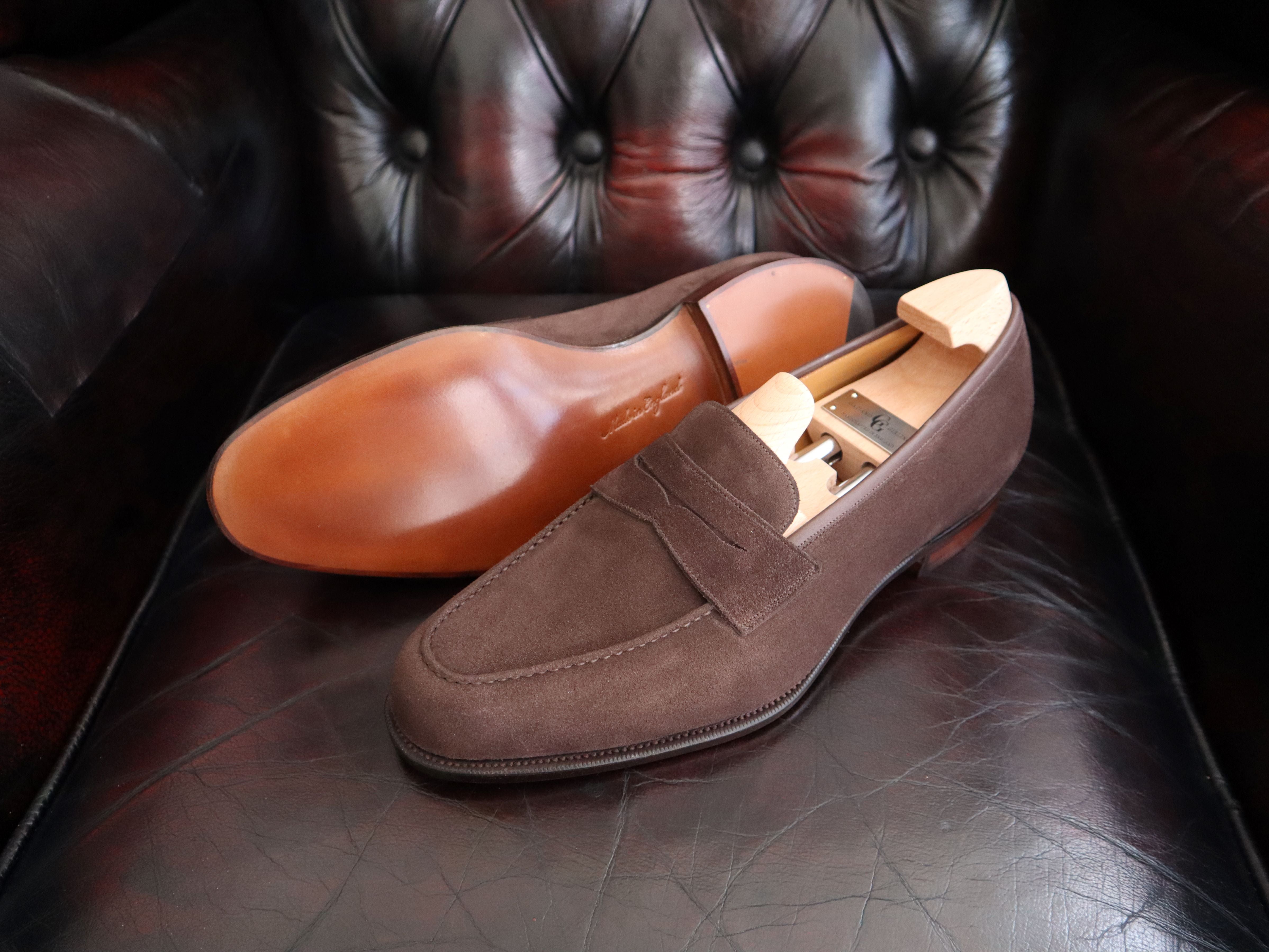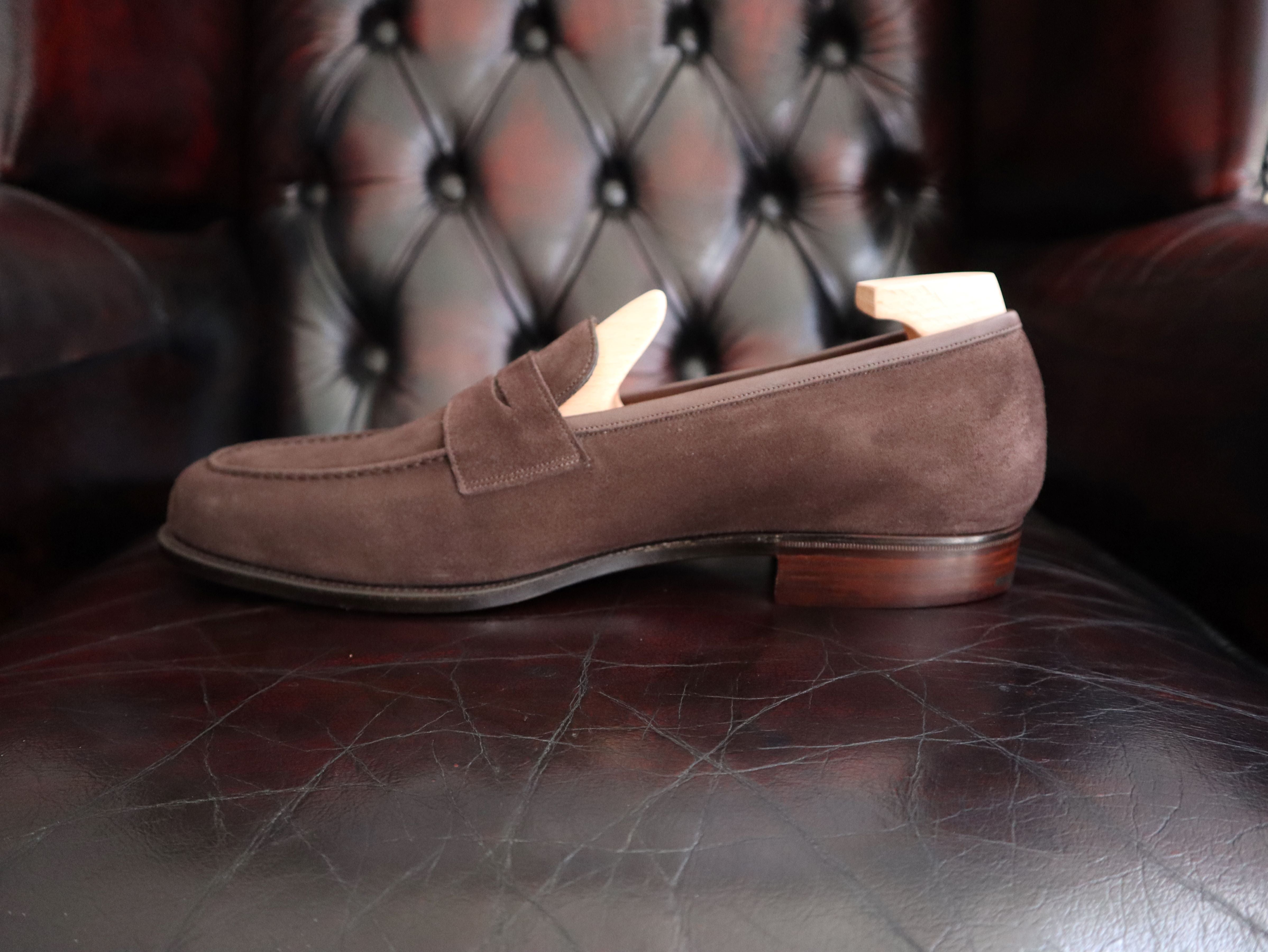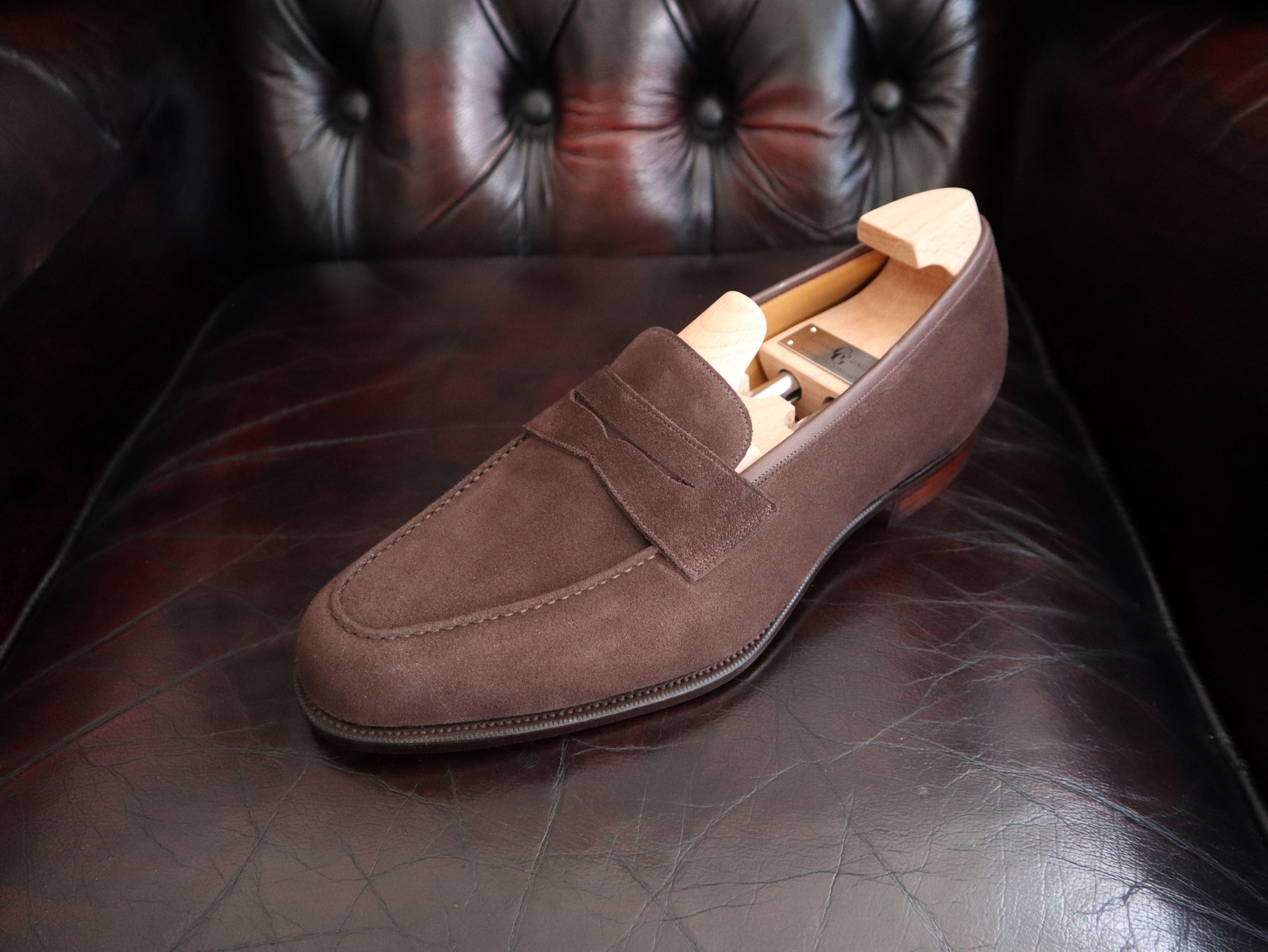 Our English Penny Loafer from the Classic collection. Hand crafted in Mole Suede and on our Slip-On Round Toe C39 last. The Classic range has a more traditional finish on our Oak Bark soles and a lower heel.