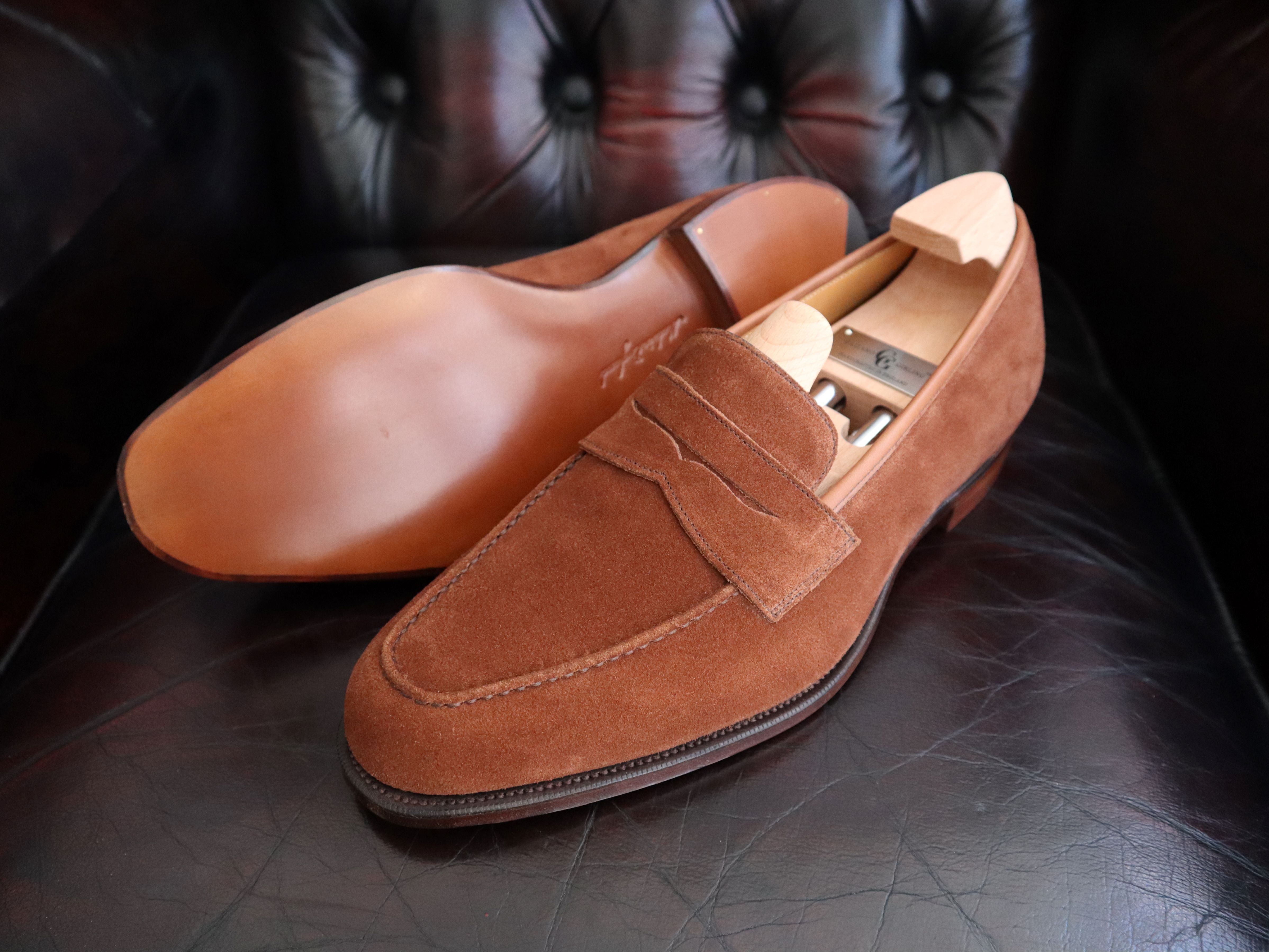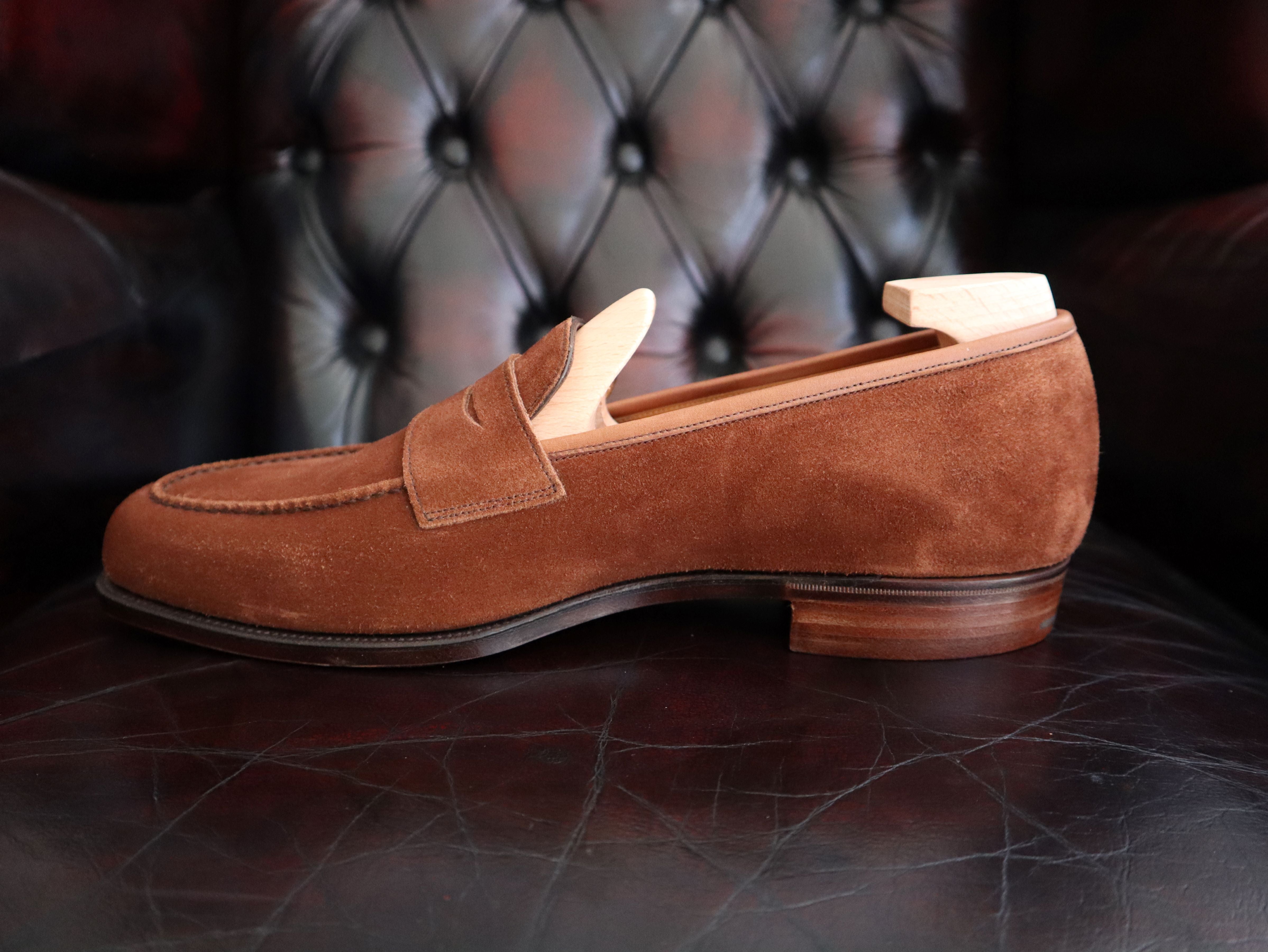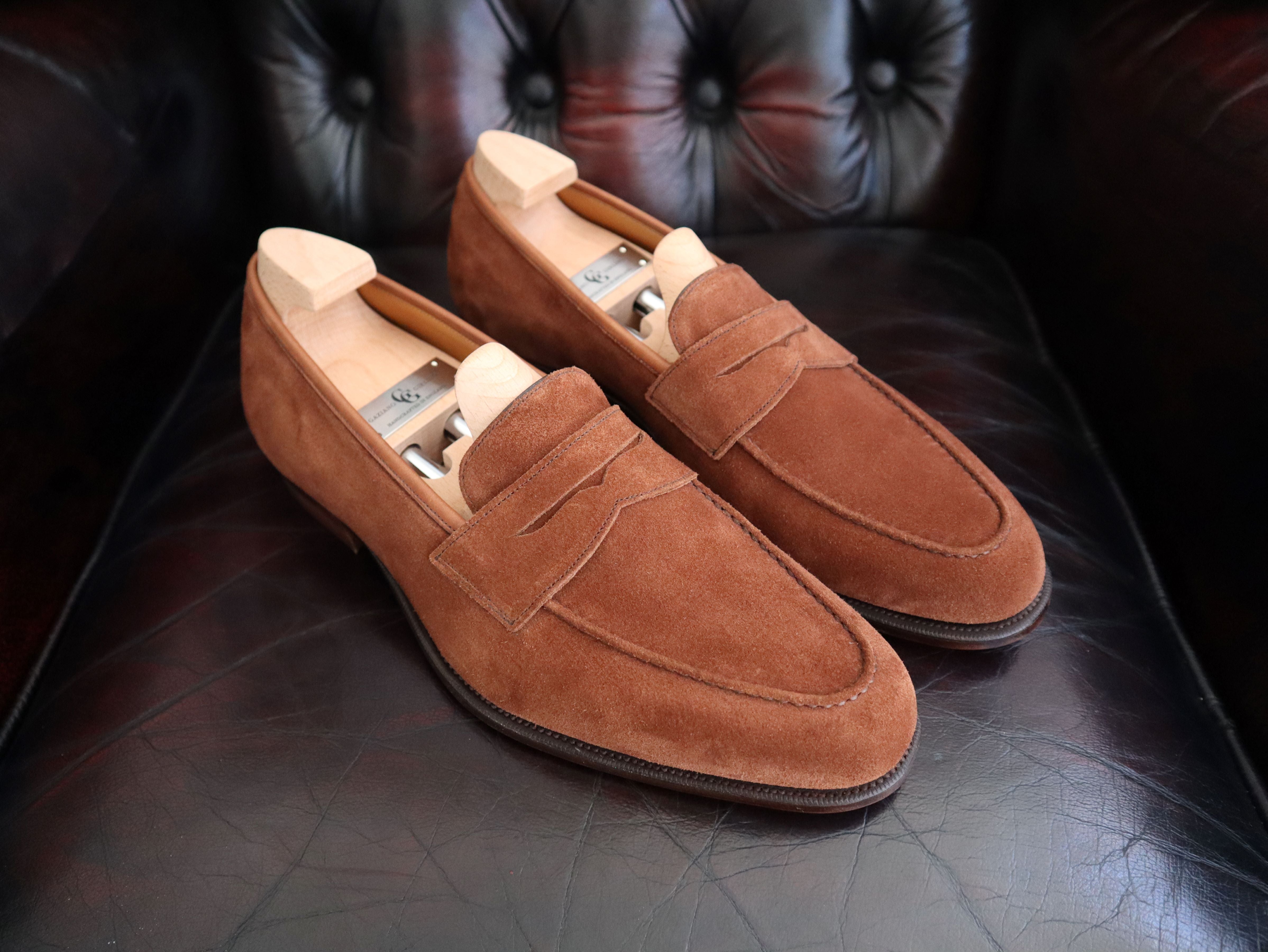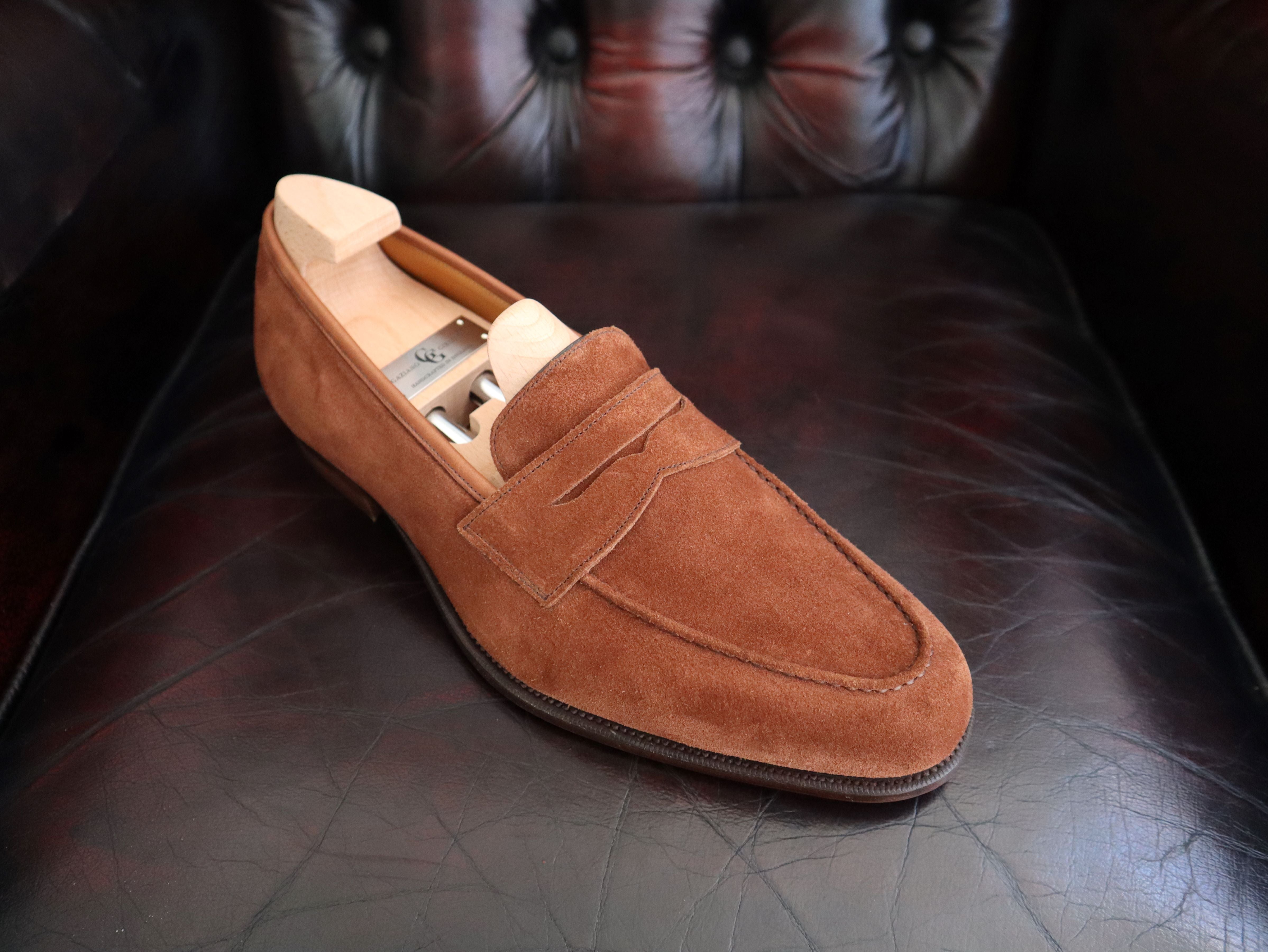 Our English Penny Loafer from the Classic collection. Hand crafted in Polo Suede and on our Slip-On Round Toe C39 last. The Classic range has a more traditional finish on our Oak Bark soles and a lower heel.