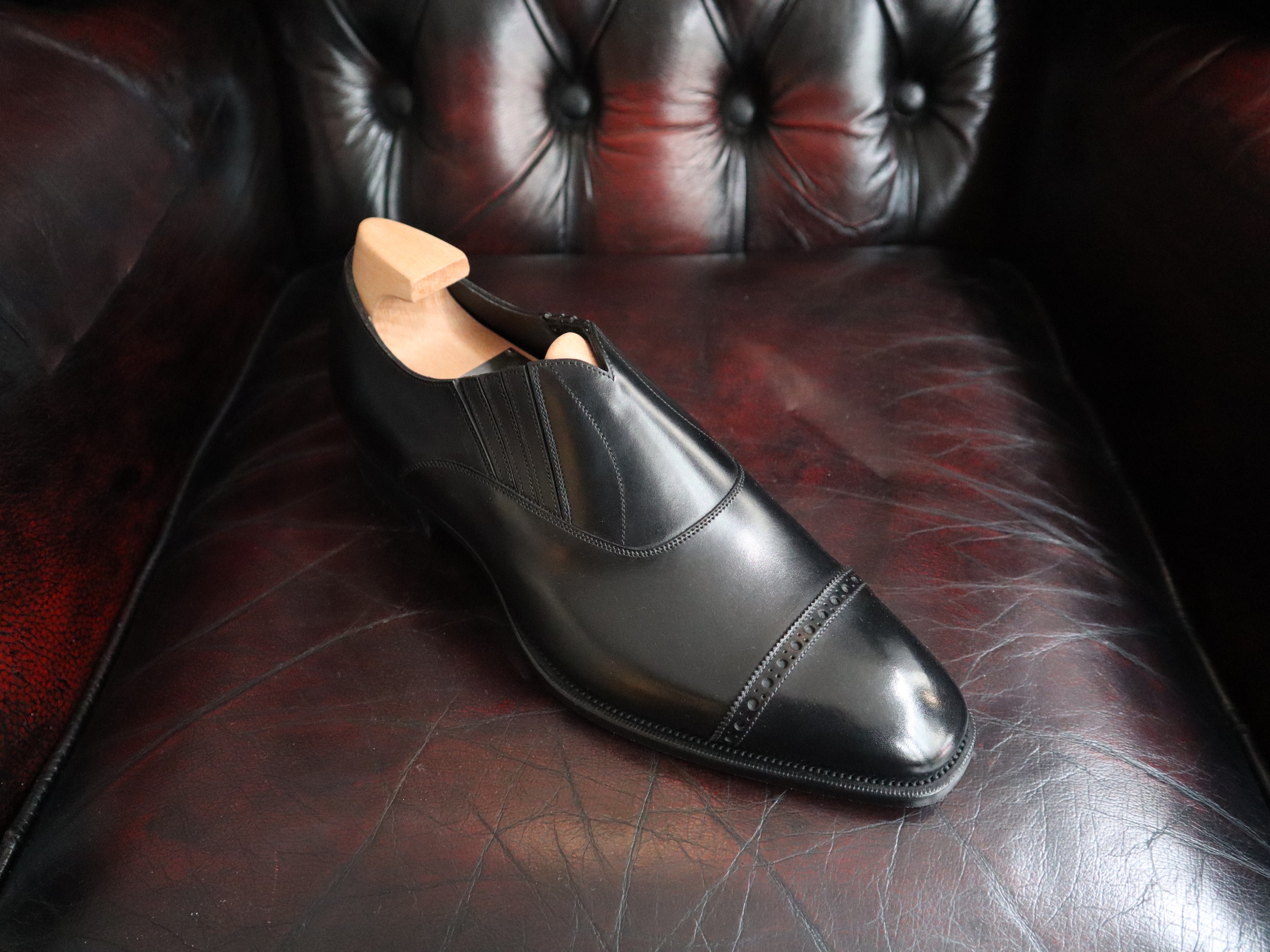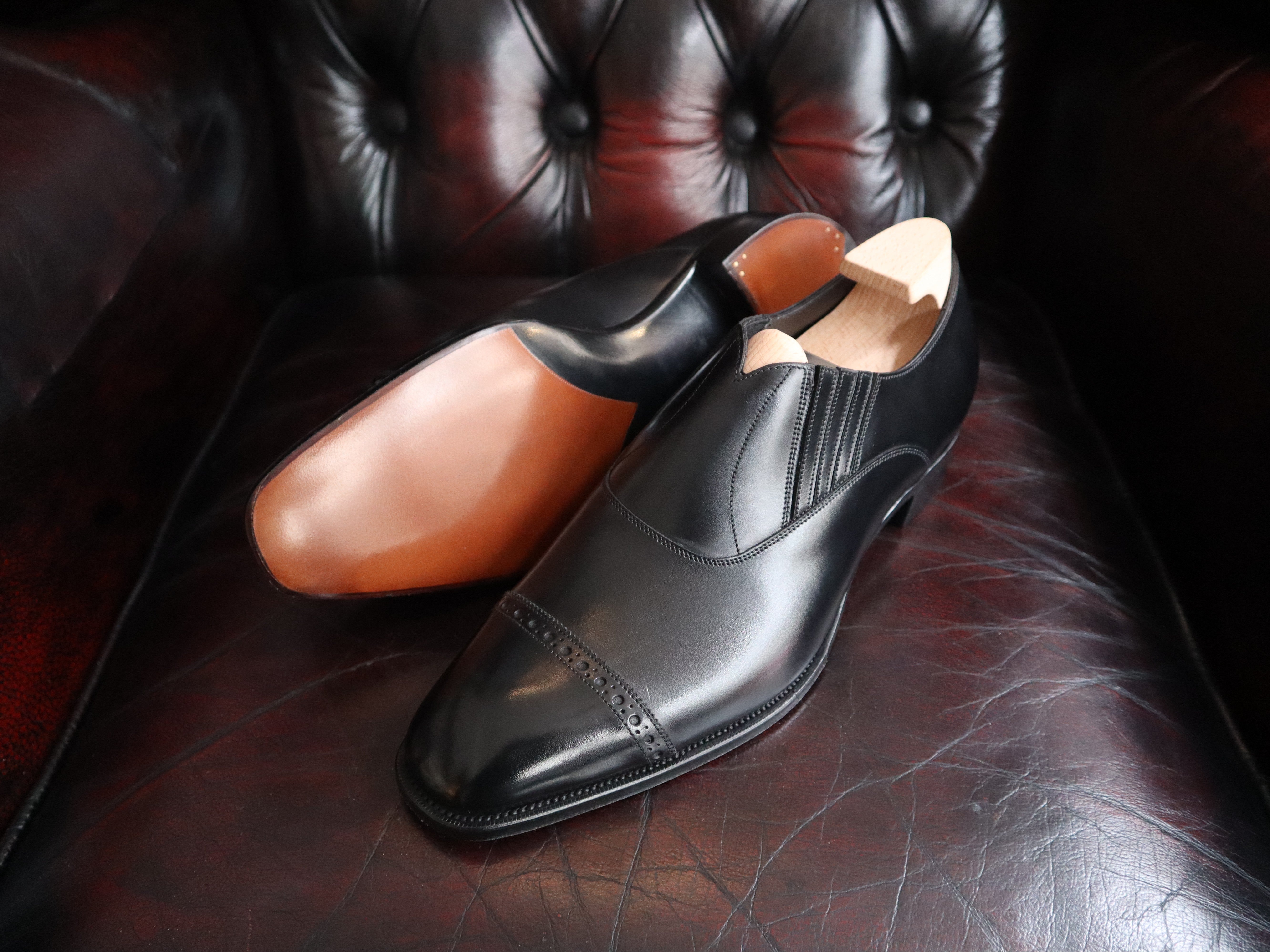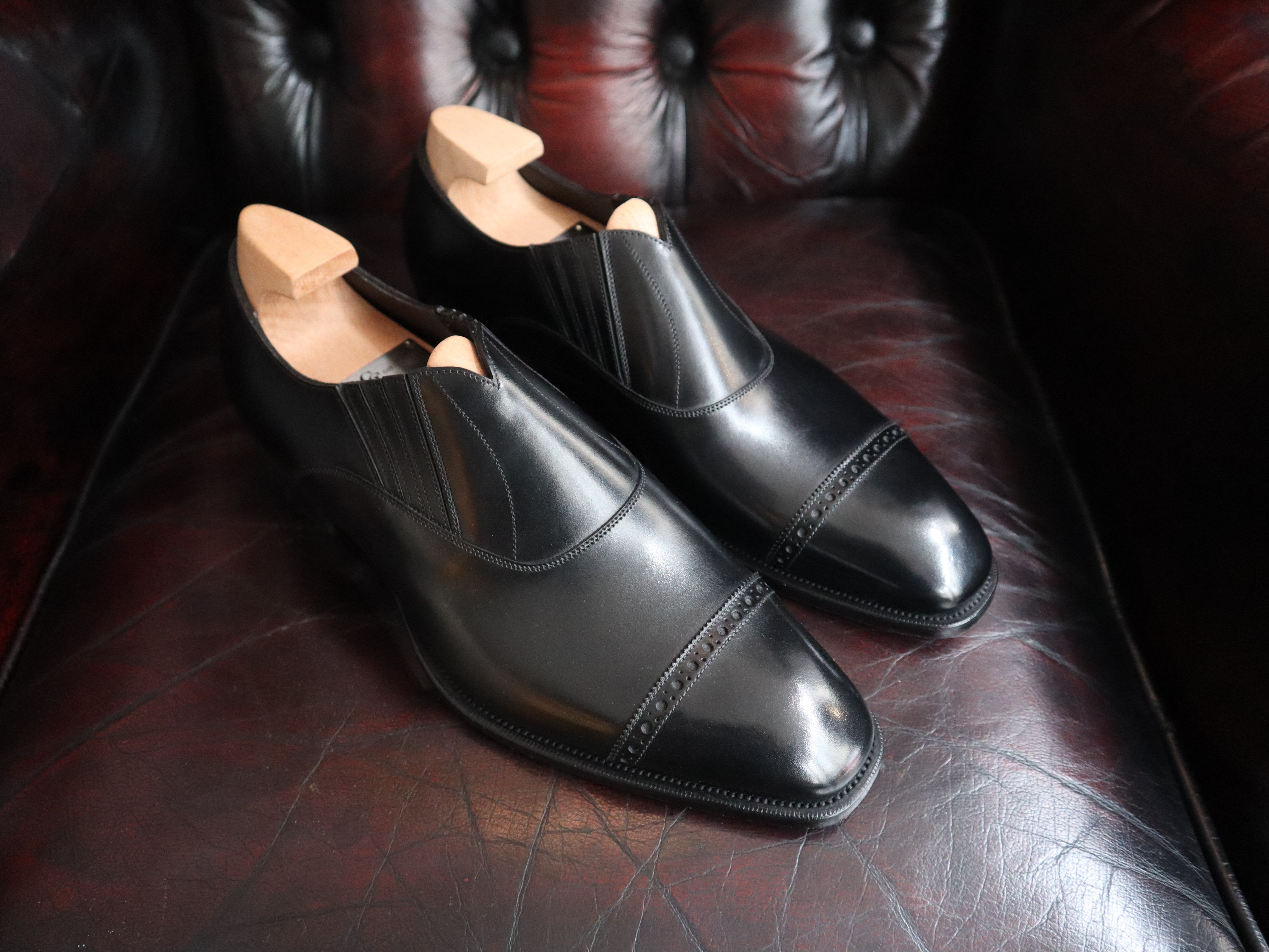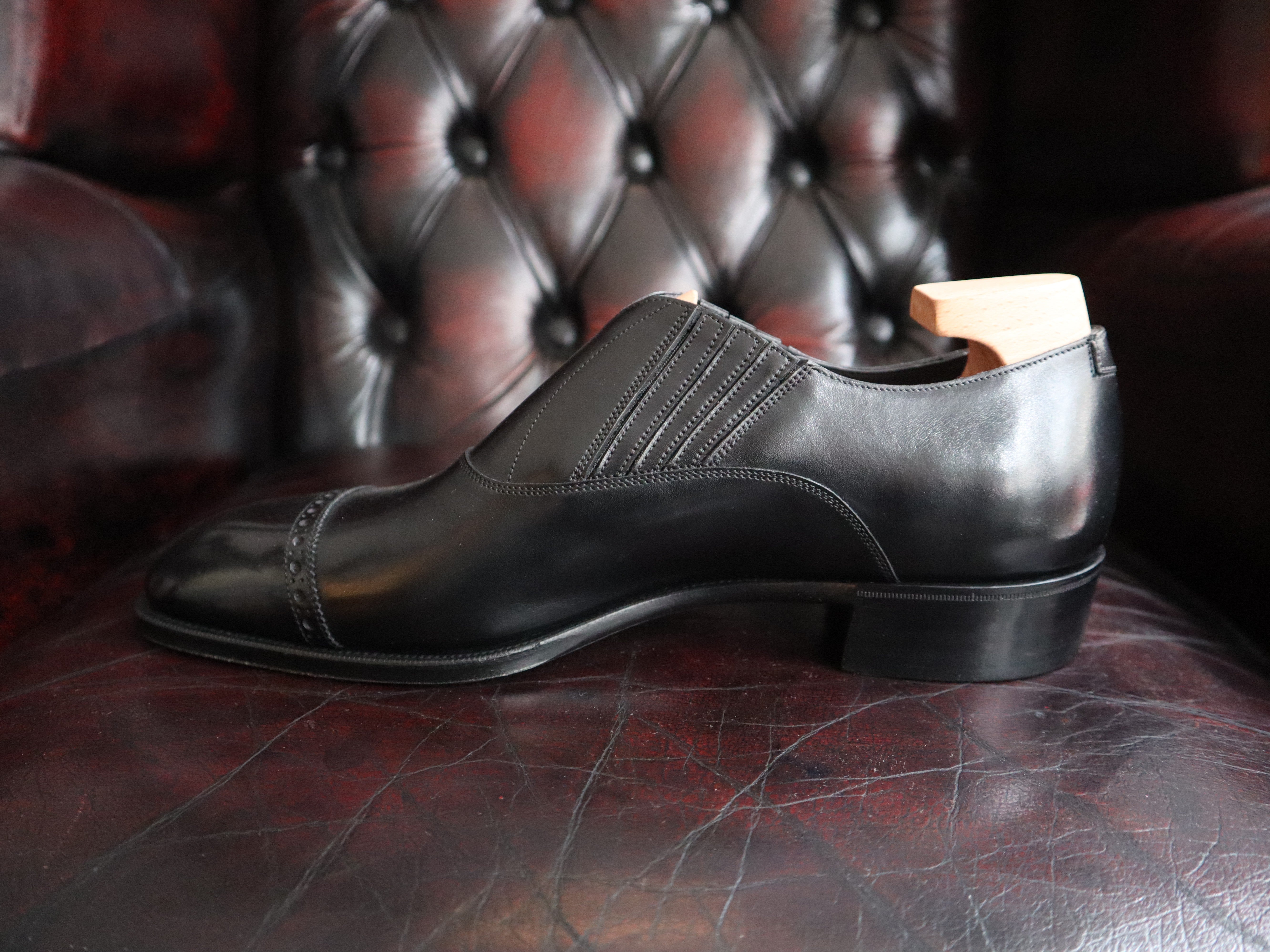 A cap-toe lazyman with an elastic gusset, the Langham gives admirers of the lazyman concept a model which maintains a formal and elegant aesthetic with the comfort and efficiency of a slip-on. Handcrafted from beautiful Black Calf on our Soft Square MH71 last.