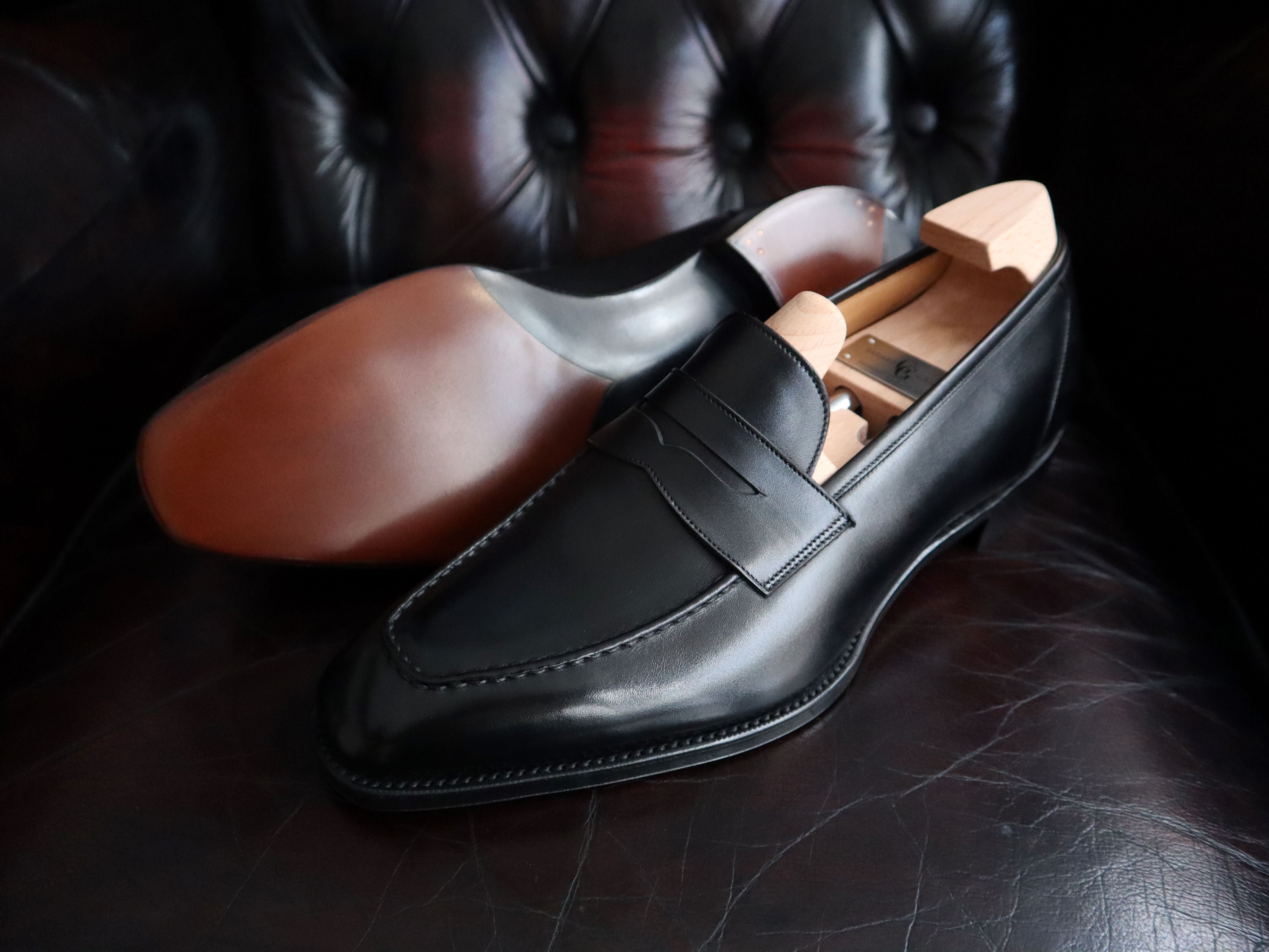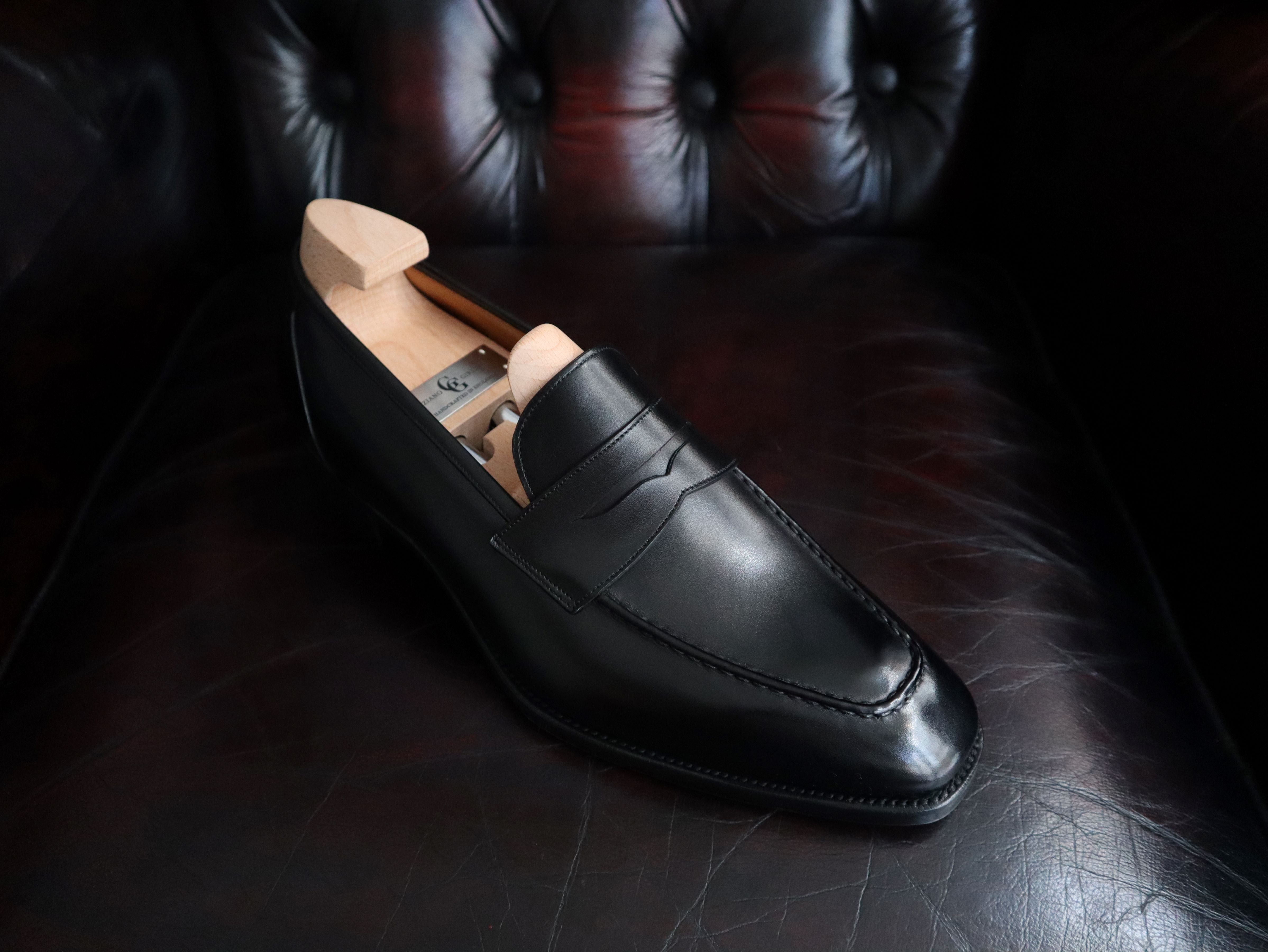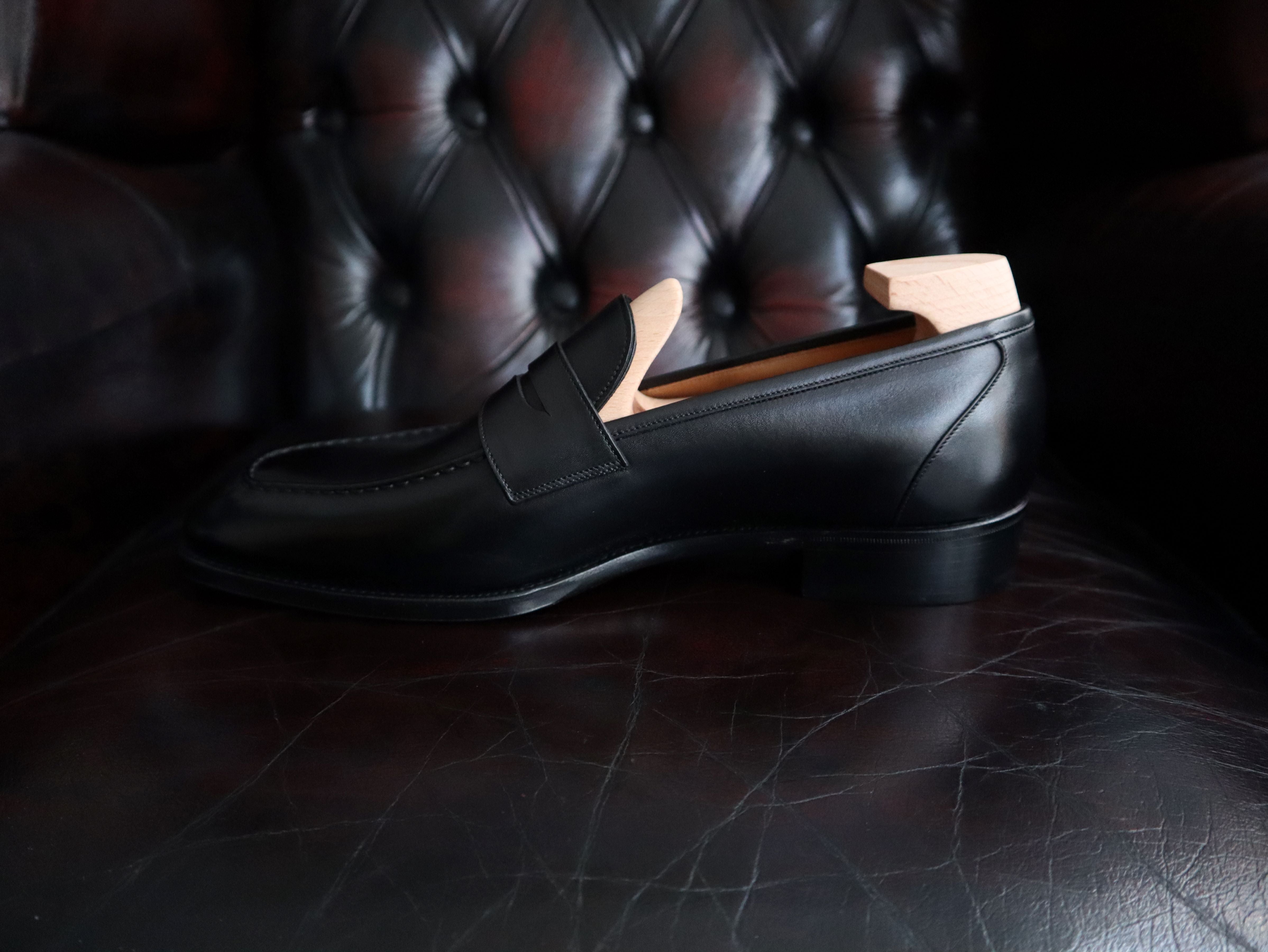 Our stylish Penny Loafer with a hand-sewn apron. Hand crafted from beautiful Black Calf on our Soft Square Slip-On KN14 last.